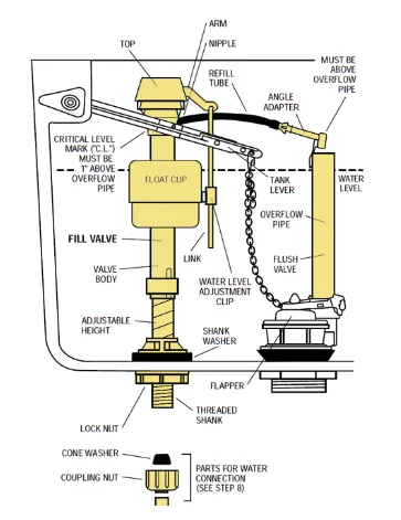 If that isn?t the case then we will tackle the fill valve or the ball cock. Most new toilets utilize a fill valve. Ball cocks are a bit outdated. Fill valves can get caked up with mineral deposits from your water. The plastic can get brittle and the float can actually fill with water. Or the sediment screen can get plugged with sediment from your waterlines. Any of these can cause your toilet to make a myriad of noises. From squeezing to humming to what sounds like a water hammer. To check the screen for buildup, shut down the water supply and flush the toilet. Reach the base of the fill valve and feel for a plastic collar. Lift it up from its current position and that will free the top from the base. Turn it over and look inside. There is a screen in there that could be blocked up. Rinse it under a faucet and put it back together. Set your collar and turn the water back on. If your issue is fixed then you?re done. Another reason your toilet could be running is your tank lever is broken or the chain is wrapped up around everything. If this is the case it would be time to install a new lever and flapper